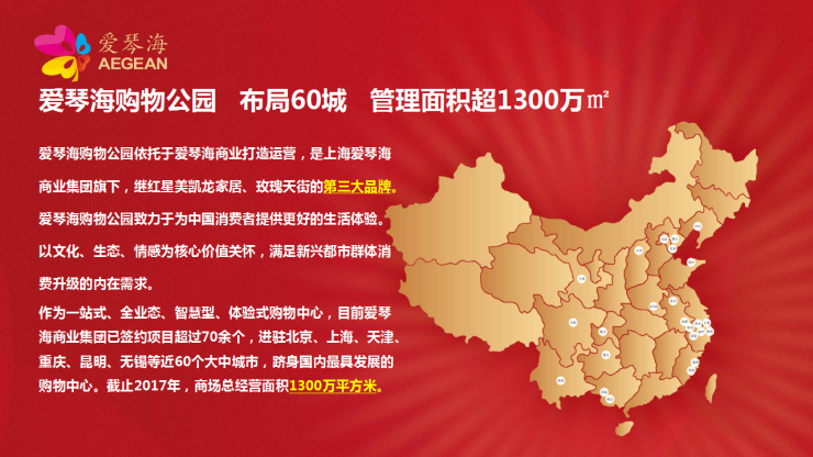 该综合体集大型购物中心(爱琴海购物公园)、星级酒店、城市休闲步行街(玫瑰天街)、商务办公、国际公寓、城市高档住宅(睿峰)等于一体,是方圆5公里内目前最大商业综合体,辐射周边近50个社区50余万人。